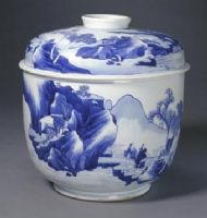 罐直口,短頸,圈足。器蓋平頂,微折沿,有環(huán)形抓鈕。罐通體飾青花山水人物圖案。青花嬌艷青翠,清新明快,具有水墨畫的藝術(shù)效果。畫面層次分明,富有立體感。畫中的文人高士、獨(dú)釣老翁等形象生動。此器胎精體重,瓷質(zhì)潔白細(xì)膩,為康熙朝民間青花瓷器的代表作。