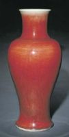 尊撇口,短頸,圓肩,長斂腹,近足處外撇,圈足。外施紅釉,里口和底部施蘋果綠釉。此器風(fēng)格樸實,造型端莊規(guī)整,釉色紅艷光亮,是康熙時郎窯紅釉瓷器的典型作品。