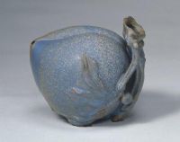 水注為橫臥桃形,一側(cè)以雕琢枝干為柄,另一側(cè)的桃尖處開注口。胎質(zhì)灰白,胎薄體輕。通體施仿宋鈞窯天藍(lán)釉,灰藍(lán)色釉地中密布白色、橘黃色的斑點(diǎn)。釉層較厚,開片細(xì)密。無款識。