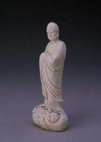 此像人物塑造生動,五官緊湊,眼聚沉思,神色安然從容,體現(xiàn)出達摩直契佛心自明永恒的堅定與淡然。洶涌翻卷的海浪,隨風飄拂的衣衫都塑造得很有動感。瓷像施釉如凝脂,似美玉,滋潤柔滑。其工藝成就代表了明代德化窯的制瓷水平。此達摩像的制作手法與故宮博物院收藏的明代德化窯“何朝宗”款達摩像十分相似,只是尺寸較小。