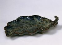 洗通體仿楸葉形,內(nèi)外雕刻凹凸的葉脈,葉邊堆貼4朵盛開的花,并刻出7枚花蕾。胎體厚重,釉層凝厚,深藍(lán)色釉中滲化出蔥白色雨點(diǎn)狀花斑。此洗造型新穎,窯變花釉揮灑自如,卷曲的葉邊仿佛被微風(fēng)吹動(dòng),頗有天然韻致。