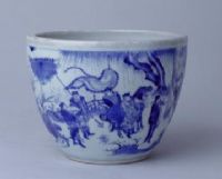 明末清初時(shí)期,文學(xué)藝術(shù)繁榮,不僅為瓷器紋樣提供了豐富的創(chuàng)作題材,而且還深刻影響著瓷器裝飾畫面的藝術(shù)表現(xiàn)手法。民窯瓷器上的許多人物畫中除了常見的嬰戲圖、八仙祝壽外,表現(xiàn)戲曲故事也特別盛行,《三國(guó)演義》、《西廂記》、《水滸傳》等作品中的內(nèi)容比比皆是,這與明代萬歷以來帶有版畫的戲曲劇本的大量流行有關(guān)。