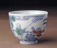 斗彩初創(chuàng)于明宣德年間,是一種以釉下青花勾線,再以釉上彩繪填彩的方法。斗彩工藝至成化年間趨于成熟,燒制的斗彩瓷也最為精美,因使用的是國(guó)產(chǎn)平等青料,具有呈色穩(wěn)定、色澤淡雅的特點(diǎn),再加艷麗的釉上色彩,使其形成主次分明、交相輝映的藝術(shù)格調(diào)。《博物要覽》云:“若宣窯五彩,深厚堆垛,成窯用色淺深,頗有畫意。”成化官窯制品常見高足杯、酒杯、盤、碗、罐等小型器物,造型玲瓏奇秀,胎體細(xì)潤(rùn),彩料精純,繪畫淡雅幽婉。此件斗彩嬰戲圖杯即其中的代表作之一。此杯造型輕盈秀雅,胎體潔白細(xì)膩,所繪嬰戲紋飾為成化器中少見的題材,愈益珍貴。明嘉靖年間有此件器物的仿品。