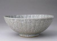 明代仿哥窯瓷器的傳世品迄今所見最早為宣德時(shí)景德鎮(zhèn)官窯的制品,造型有菊瓣碗、雞心碗、菊瓣盤、折沿盤、撇口盤等,多署有青花宣德年款。這些器物的釉面光潔度偏低,有油膩感,與宋代哥窯器的釉面相似,但也有橘皮紋這一宣德官窯器的典型特征。其釉色有青灰、月白等,開片的紋路微微閃黑、閃紅,沒有宋哥釉器“金絲鐵線”和“紫口鐵足”的效果。