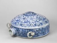 瓶直口,短頸,頸部凸起一周弦紋,一側(cè)飾小系。腹體一面扁平無(wú)釉,中心凹進(jìn)如臍,另一面隆起,中心凸出如半球狀,肩兩側(cè)各有一活環(huán)耳。通體以青花裝飾,口沿處繪纏枝花,腹部凸起處飾海水江崖地八角錦紋,內(nèi)繪纏枝花,其外圍飾纏枝花,瓶壁側(cè)面飾海水江崖紋。青花色澤濃艷,紋飾流暢自然,極富動(dòng)感。