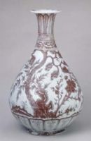 釉里紅是元代景德鎮(zhèn)窯創(chuàng)燒的一個(gè)品種,燒成難度大。此件玉壺春瓶繼承元代釉里紅的燒制技術(shù),紅呈色較純正,紋飾清晰,是明初景德鎮(zhèn)釉里紅之佳作。