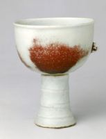 此杯裝飾斑塊發(fā)色鮮艷,似晚霞般美麗,實屬難得之珍品。可以任意轉動的杯足更增其玩賞性。1980年,江西省高安縣元代瓷器窖藏曾出土一件元代釉里紅印花塑貼蟠螭紋高足杯,其杯足亦可轉動。由此可知,轉把高足杯是元代高足杯的時代特征之一。
