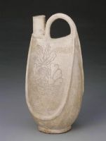 此壺扁圓形,短流,肩上有一提梁,圈足。通體施白釉,壺身兩面刻花葉紋。此器樸素粗獷的風(fēng)格反映了游牧民族豪放的氣質(zhì)。