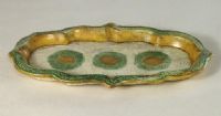 長(zhǎng)盤作八曲海棠式,折沿寬邊,平底。盤內(nèi)模印花卉,口沿為卷枝紋,盤心以模印的水波紋為地,中央一線排列3朵蓮花。盤內(nèi)紋飾以黃、綠、白釉三色施彩。
