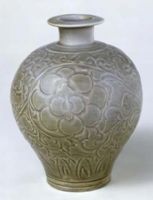 耀州窯刻花青瓷以盤碗為多,瓶類較少。此瓶小口短頸,襯出瓶身的雍容飽滿,刻線處積釉色深,凸起處色較淺,使花紋更加清晰,有立體圖案的效果,為耀瓷中的精品。