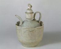 注子小圓口,有蓋,蓋頂飾獅形鈕,折肩,弧形流,曲柄,圈足。注碗葵瓣式口,碗體呈六瓣形,圈足。通體施青白釉。