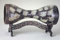 腰鼓廣口,纖腰,鼓身凸起弦紋七道。通體以花釉為飾,在漆黑勻凈的釉面上,潑灑出塊塊藍(lán)白色斑點(diǎn),宛如黑色閃緞上的彩飾,優(yōu)美典雅。