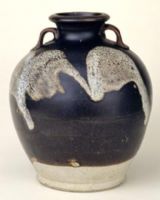 罐口微外撇,短頸,頸兩側對稱各置一系,豐肩,肩以下漸收,平底。近底處刻深弦紋一道。通體施黑釉,近底處露胎。烏黑的釉面上裝飾四塊灰藍色斑塊,似色料自然流淌而成,妙趣天成。