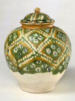 罐口微撇,短頸豐肩,肩下漸收至底,平底圈足。罐蓋尖頂,出邊,直口,蓋與罐口不吻合,略小于罐口。罐口施黃釉,罐身施釉不到底,以綠釉為地,襯以白點(diǎn)及黃道組成的菱花圖案,蓋面以綠釉為地,襯以白點(diǎn)及黃道組成的四瓣紋飾。