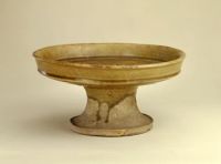 此盤直口微外撇,盤心坦平,有印花裝飾,并有五個支釘痕,下承以空心喇叭狀高足。通體內(nèi)外施黃釉,但外壁僅施半截釉。