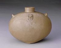 壺小直口,肩上有兩小系,器身呈扁橢圓形,平底微內(nèi)凹。通體施青釉,雙系之間印圓圈帶狀裝飾,中間貼塑一獸頭,這是西晉時期普遍采用的一種裝飾方法。扁圓的形體和設計巧妙的雙系使之既實用又便于攜帶。