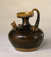 壺洗口,短頸,圓腹,平底,肩部一側(cè)飾雞首流,流內(nèi)有孔與壺身相通,流嘴呈筒狀,雞冠高聳,雙目圓睜。與雞首相對的一側(cè)飾一彎形圓柄,上下分別與口沿、肩部相接,便于握持。肩部另外兩側(cè)各飾一橋形系,可穿繩提攜。壺施黑釉,釉層豐厚,釉面滋潤透澈,色黑如漆,勻凈無瑕。外壁施釉不到底,近足處露出褐色的胎體。此器制作端正,各部位比例協(xié)調(diào),尤其是以雞首裝飾壺體,給人一種視覺上的美感。