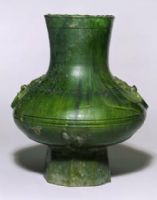 壺盤口,長頸,肩部置對稱鋪首耳,垂腹,腹下承以外撇高圈足。壺通體施低溫鉛綠釉,釉呈瓜皮綠色。口、頸、腹部均飾凸起的弦紋。