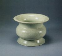 器型為外翻敝口,束短頸,扁圓鼓腹,喇叭狀圈足。通體施釉,釉色白中閃青。在尊的鼓腹部,飾以暗花纏枝牡丹刻化紋。從它的胎骨較厚重、胎質(zhì)堅(jiān)致、釉面有細(xì)碎開(kāi)片紋、圈足底有墊餅裝匣仰燒的痕跡及粘砂等特點(diǎn)來(lái)看,當(dāng)屬北宋景德鎮(zhèn)窯之器。青白釉釉質(zhì)含鐵量低,瓷匠在燒窯過(guò)程中熟練地掌握了強(qiáng)還原焰,使這件瓷尊的色澤達(dá)到了白里泛青、溫潤(rùn)如玉的效果,形制上,則是明顯的模仿青銅尊的款式,其口沿外敝,頸部束收,鼓腹,下接喇叭形圈足,古樸柔韌的造型,厚薄相濟(jì)的胎骨,賦予尊體的端莊,渾厚的氣度,腹部飾以暗花纏枝牡丹紋,構(gòu)圖簡(jiǎn)煉,纖細(xì)的紋線流暢飄逸,又賦予器物以秀美、恬靜的意境,整體古樸中見(jiàn)典雅,端莊中溢魅力,顯示了非凡的制瓷技藝。