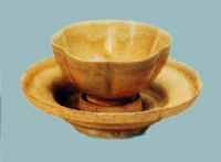 盞呈花瓣形敞口,弧壁,圈足。托形圓似盤,花邊卷口,盤中心有作為承托的凸起的圓圈(即托口)以承盞。通體青白釉泛黃,并有細(xì)碎開片。唐宋時期飲茶之風(fēng)大盛,南北瓷窯競相生產(chǎn)各類茶具。此件托盞為宋代繁昌窯產(chǎn)品。