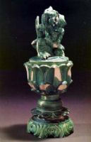 黃白色胎,胎質(zhì)較松。綠釉厚潤。爐身飾四層仰蓮,有的蓮瓣不施釉,露黃白色胎。蓋頂飾一雄獅,側(cè)首,張口,翹尾,前足踩于彩球上,頸上掛三枚響鈴。姿態(tài)雄健,生動(dòng)可愛,是一件難得的陶瓷工藝品。
