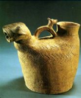 胎色灰白,釉色淡黃,且薄而均勻。以虎首為流,一獸作提梁?凇⒏购偷拙蕶E圓形。背面和上腹刻劃方折紋,腹下部刻劃豎線紋和方格紋。整器猶如一只張口、翹尾的猛虎,造型頗為別致。