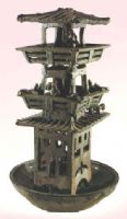 紅陶胎,通體施綠釉。水池與亭榭連體制作。水池呈圓形,埂上塑有羊、奔鹿、鵝、雞和武士俑二人、吹奏俑三人,池內(nèi)有鵝、鴨、龜、魚等動物和梭形小舟,舟內(nèi)置篙和槳。池中矗立由四根扁柱支撐的四阿重層式亭榭,其正門外架一小橋通向池岸,橋邊有二人恭立,亭內(nèi)有一人袖手端坐。