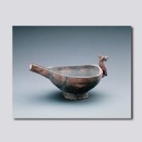 首都博物館藏。泥質(zhì)灰陶。仿青銅禮器。敞口,淺腹,平底,鋬?yōu)轼B首狀,鳥尾為流。周身滿繪朱彩流云紋。