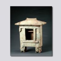 首都博物館藏。泥質(zhì)紅陶。除后壁外通體施綠釉。單間,四阿頂,前開長方形門,門兩側(cè)有立柱,倉內(nèi)上層有隔板。倉底四角,前為立姿人物形足,后為板狀足。