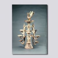 首都博物館藏。泥質(zhì)紅陶。明器。外施綠釉。由燈座、燈盤、燈柱組成。燈盤分三層錯落而置,每層又分出三枝燈,最上層盤中立朱雀。當(dāng)燈點燃以后,交相輝映,有如花樹,呈現(xiàn)豪華氣派。這種多支陶燈一般三至十五枝不等,河北滿城中山靖王墓中出土的最多為十五支。多支燈一般為貴族使用。