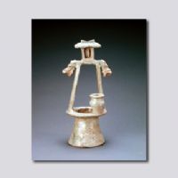 首都博物館藏。明器。通體施綠釉,由井亭和井圈組成。亭內(nèi)有井架、轆轤。轆轤呈細(xì)腰形。井架兩側(cè)有龍頭形裝飾。井圈為圓形,井沿上有汲水用的小水罐。生動(dòng)的再現(xiàn)了東漢時(shí)人汲水之情形。漢代井為汲水飲用或灌溉之用。