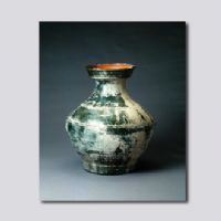 首都博物館藏。泥質紅陶。盤口,束頸,溜肩,鼓腹,平底,腹部兩側貼對稱鋪首銜環(huán)。壺外施低溫綠釉,內(nèi)口沿施黃釉。頸、肩部各有兩道弦紋,壺底有支燒痕。