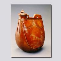 首都博物館藏。泥質(zhì)紅陶。扁圓形,小口,塔式蓋,凹底。底滿釉,有三個(gè)支釘痕,通體施醬黃色釉。器身有仿皮囊壺的縫制痕跡。