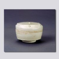 首都博物館藏。子母口,直壁,圈足,平頂蓋。通體施白釉。蓋面及邊緣有鼓釘裝飾,上下口沿無釉,足脊無釉。釉面白中微泛黃,胎體堅致。