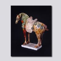 首都博物館藏。明器。馬立于長方形扁平托板上,馬頭左偏略下垂,表現瞬間動態(tài),極為自然生動。鬃毛飾綠彩,自然下垂。身體呈棗紅色,鮮麗明快,膘肥體壯,四肢健碩,腿部肌肉表現寫實,自然,應為捏制。鞍韉齊備:頭有當盧、絡頭、鑣、銜,頸佩攀胸、杏葉,背負鞍韉、障泥、馬鐙,尻飾秋、杏葉、束尾。鞍為后橋傾斜鞍,鞍后垂有鞘。鞍韉、障泥皆無釉,但裝飾華美、立體感很強,是主人身份高貴的象征。從其未罩鞍袱來看,應是一匹正在騎用的良馬。唐三彩是對唐代三彩鉛釉陶的簡稱,以白色粘土為胎,用銅、鐵、鈷、錳等金屬為釉料的著色劑,使釉在燒制過程中粘度小,流動性大,易垂流、暈散并可降低燒制的溫度。其燒制工藝是兩次燒成,先在1100℃左右高溫下燒素坯,然后在已素燒過的胎體上施釉,再經900℃低溫燒成。一般有黃、綠、藍、白等多種色彩,以黃、綠、白色為主。唐三彩工藝始創(chuàng)于唐高宗時期,至玄宗時達到鼎盛,主要用于陪葬。