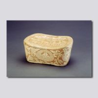 首都博物館藏。元寶形,枕面中心以珍珠紋為地,刻“齊壽”二字,四周刻卷草紋邊飾,“齊”字下腳空隙處,巧飾葉紋壓肩。枕四壁以珍珠紋為地,刻纏枝菊花,底刻“大吉”字樣;y凹處刻劃較深,經(jīng)燒造后呈褐色。珍珠地紋飾,源于唐代金銀器上的鏨花裝飾,河南密縣窯在唐代首先應(yīng)用于瓷器裝飾。其工藝是用管狀竹木或金屬工具,在施好化妝土的坯體上戳印而成,圓點(diǎn)周?chē)冻鎏ンw本色,中心是白色,再施以透明釉。經(jīng)高溫?zé)旌,形成色調(diào)對(duì)比強(qiáng)烈的藝術(shù)效果。