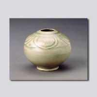 首都博物館藏。收口,豐肩,鼓腹,圈足,足脊無釉?谘叵驴谈采彴昙y,并劃出筋脈。內(nèi)外施青釉,口沿下有開片,釉層澄澈。胎體輕薄,造型精巧,是一件別具一格的文房用品。