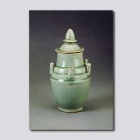 首都博物館藏。直口,粗頸,肩部呈階梯狀,飾向上五管,收腹,圈足,寶剎式蓋。通體施青釉,釉面青翠,有大開(kāi)片,釉層清澈,胎體厚重。