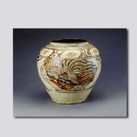 首都博物館藏。直口,短頸,豐肩,下腹內(nèi)收,隱圈足,砂底無釉。周身上化妝土,在用白地黑花赭彩繪畫,肩部為開光花卉,腹部繪開光云鳳紋,鳳舞雙翅,形象生動(dòng)。