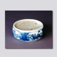 首都博物館藏。鼓式,圓唇,腹微鼓,腹部飾青花開光海獸紋。底書青花雙圈“大明崇禎年制”6字雙行楷款。青花顏色較深。造型新穎而又不失古樸,為別具一格的文房用品。