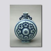 首都博物館藏。直口,扁圓腹,腹面微鼓,雙螭耳,圈足。因圓腹當(dāng)中凸出一圓月而得名。瓶口沿下和瓶周邊繪回紋,頸與圈足繪纏枝花卉。瓶腹上圍繞中心寶相花,繪8朵變形蓮瓣紋,每個蓮瓣內(nèi),分別繪輪、螺、幢、傘、花、瓶、魚、長八寶紋。底足書青花“大清乾隆年制”6字3行篆款。胎質(zhì)潔白細(xì)潤,釉色白中閃青,青花艷麗靛藍(lán),清新明快,紋飾布局疏朗。