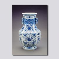 首都博物館藏。六方形,撇口,直頸內(nèi)弧,折肩,鼓腹,圈足。頸部有對稱的管狀貫耳,因而得名?谘叵吕L一周回紋,回紋下及圈足上繪折枝花卉。頸部繪海水紋,腹部每個棱面繪折枝番蓮紋。底足內(nèi)書青花“大清乾隆年制”6字3行篆書款。胎體厚重堅實,瓷質(zhì)精細,釉色白潤勻凈,青花呈色穩(wěn)定艷麗。