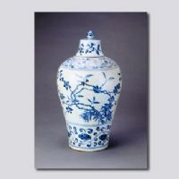 首都博物館藏。小口,圓唇,短頸,豐肩,收腹束脛,隱圈足,搖鈴式蓋,子母口。蓋上繪蓮瓣及折枝花果紋,肩部繪如意云頭紋,內(nèi)繪折枝花卉,腹部繪碧桃竹枝,脛部繪纏枝靈芝紋。青花色澤濃艷,構(gòu)圖疏密有致。造型端莊,胎質(zhì)潔白,釉色瑩潤。