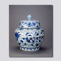 首都博物館藏。直口,豐肩,收腹,隱圈足。寶珠鈕蓋,器蓋繪仰蓮、覆蓮、云紋及折枝花果,肩部繪錦地開光花果,腹部紋飾以嬰戲為主體。底書青花“大明嘉靖年制”6字雙行楷書款。用回青料繪畫,色澤艷麗,構(gòu)圖嚴謹,層次多而不亂。胎質(zhì)精細潔白,釉汁肥潤。