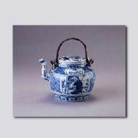 首都博物館藏。直口,圓腹,曲流,圈足,活動雙鐵鏈?zhǔn)教崃。帶蓋,蓋面繪二人對弈圖。腹部錦地開光內(nèi)各繪一彈琴仕女。外底書青花雙圈“大明萬歷年制”6字雙行楷書款。胎體堅硬,釉色白中閃青,青花色調(diào)凝重艷麗。