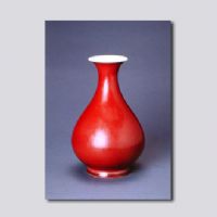 首都博物館藏。撇口,束頸,垂腹,圈足。通體施霽紅釉,呈暗紅,釉面布滿大小不等的氣孔。底書青花雙圈“大清雍正年制”6字雙行楷書款。器型較前代厚重飽滿。具有典型的時代風格。