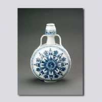 此瓶仿西亞地區(qū)阿拉伯金屬器造型及紋樣,其腹部輪花紋是阿拉伯地區(qū)特有的紋飾。景德鎮(zhèn)御窯廠同時(shí)燒造的仿阿拉伯地區(qū)器形還有花澆、水注、大盤、大扁壺、折沿盆等,反映了明朝與西亞地區(qū)的文化交流。
