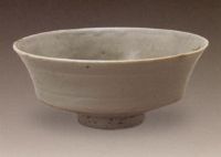 說 明: 折腰,斜壁,敞口,小圈足。內(nèi)壁印菊瓣紋一周。胎骨潔白。
