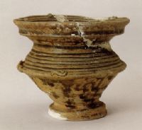 說 明: 原始青瓷。沿面內(nèi)飾弦紋,沿面外飾圓點紋。器表飾青黃色釉。