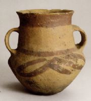 說 明: 泥質(zhì)土黃陶。小口、沿微外侈、長徑、扁圓腹、平底。